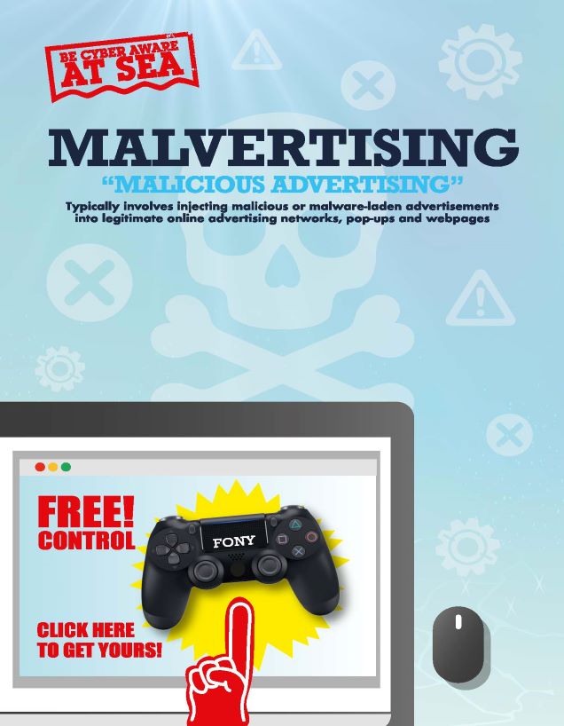 These malicious adverts do not just affect those surfing the web on land, they can also affect any users accessing the internet whilst at sea. Access to a secure network for communications and data transfer if vital at sea and malware is a huge threat, to avoiding being infected by malware though malvertising awareness is key. You will be protecting your own devices as well as the business network.